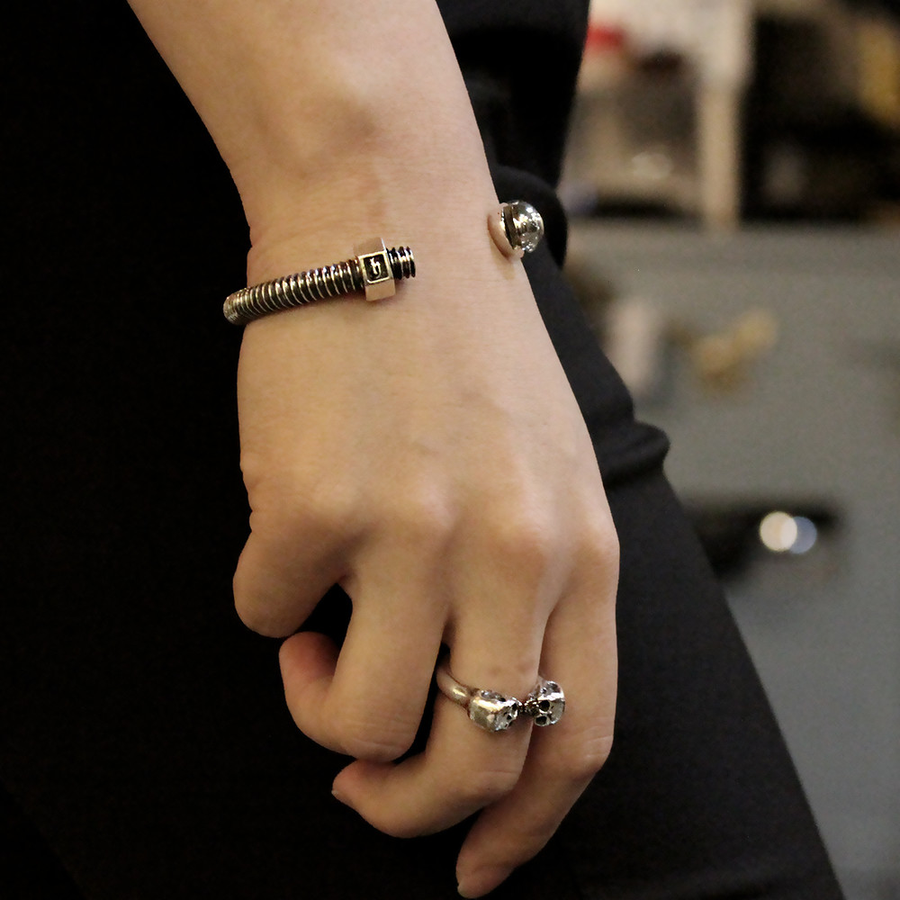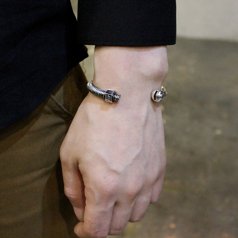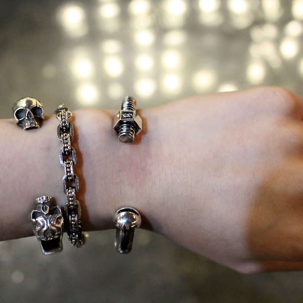 우측은 십자 볼트 헤드가 디자인된 유니크한 팔찌입니다.