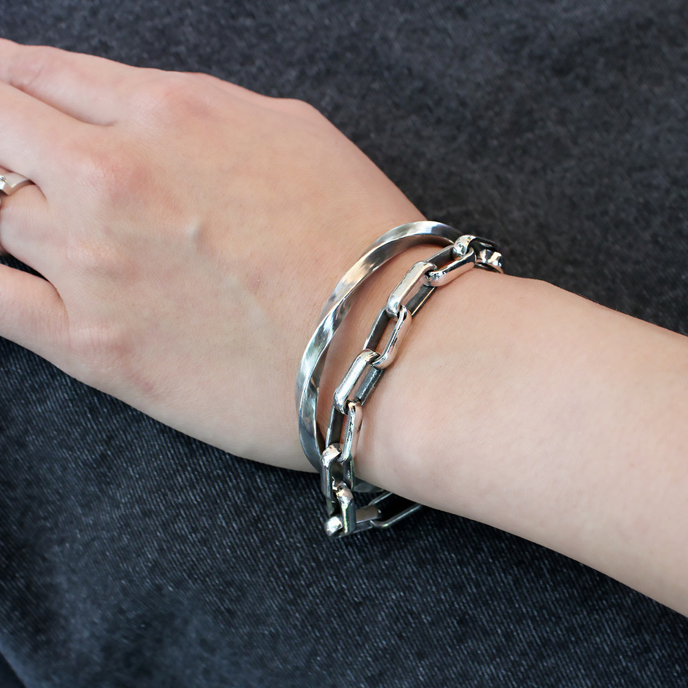 한쪽 면 너비가 넓은 곡선형 체인으로 이루어진 팔찌입니다.